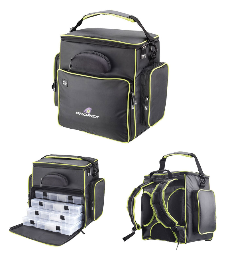 Lätt men slitstark ryggsäck med fyra stora redskapslådor i huvudfacket och två små redskapslådor vid sidan.